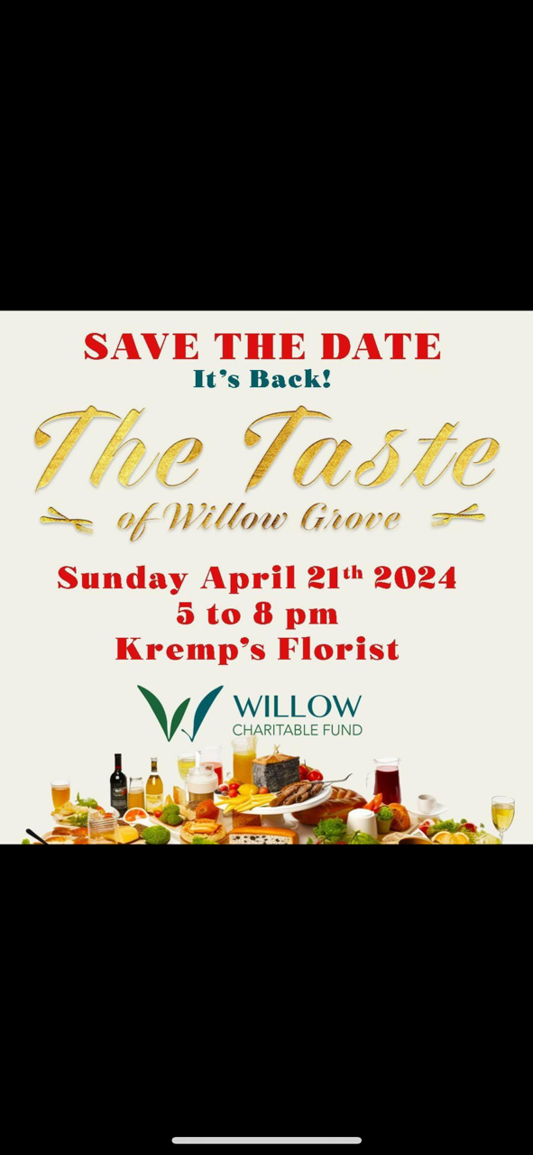 Event announcement for 'The Taste of Willow Grove' with date, time, and location details, featuring images of food and drinks at the bottom