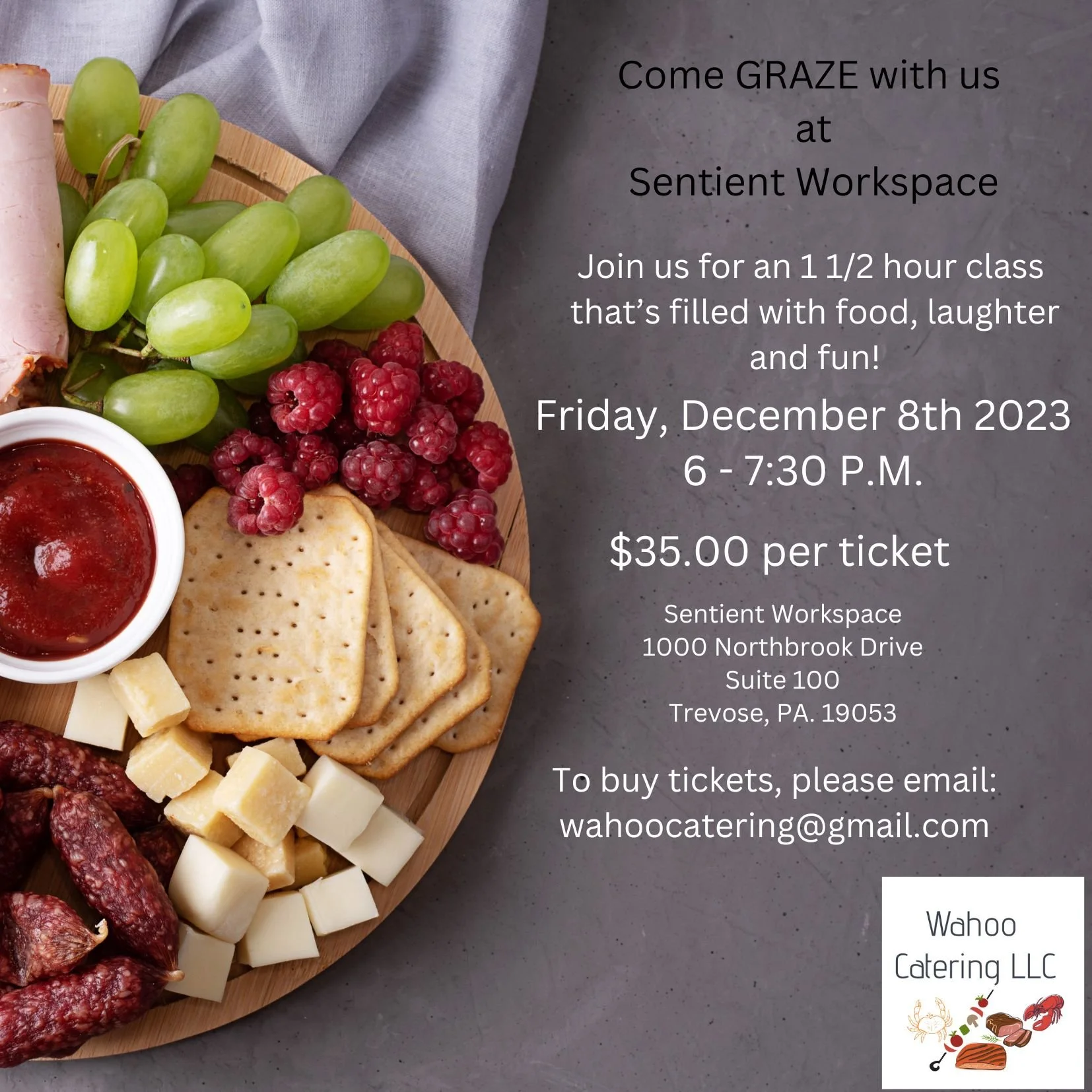 A wooden platter filled with green grapes, red raspberries, crackers, cheese cubes, salami, and a small bowl of red jam, with text on a gray background promoting a class at Sentient Workspace.