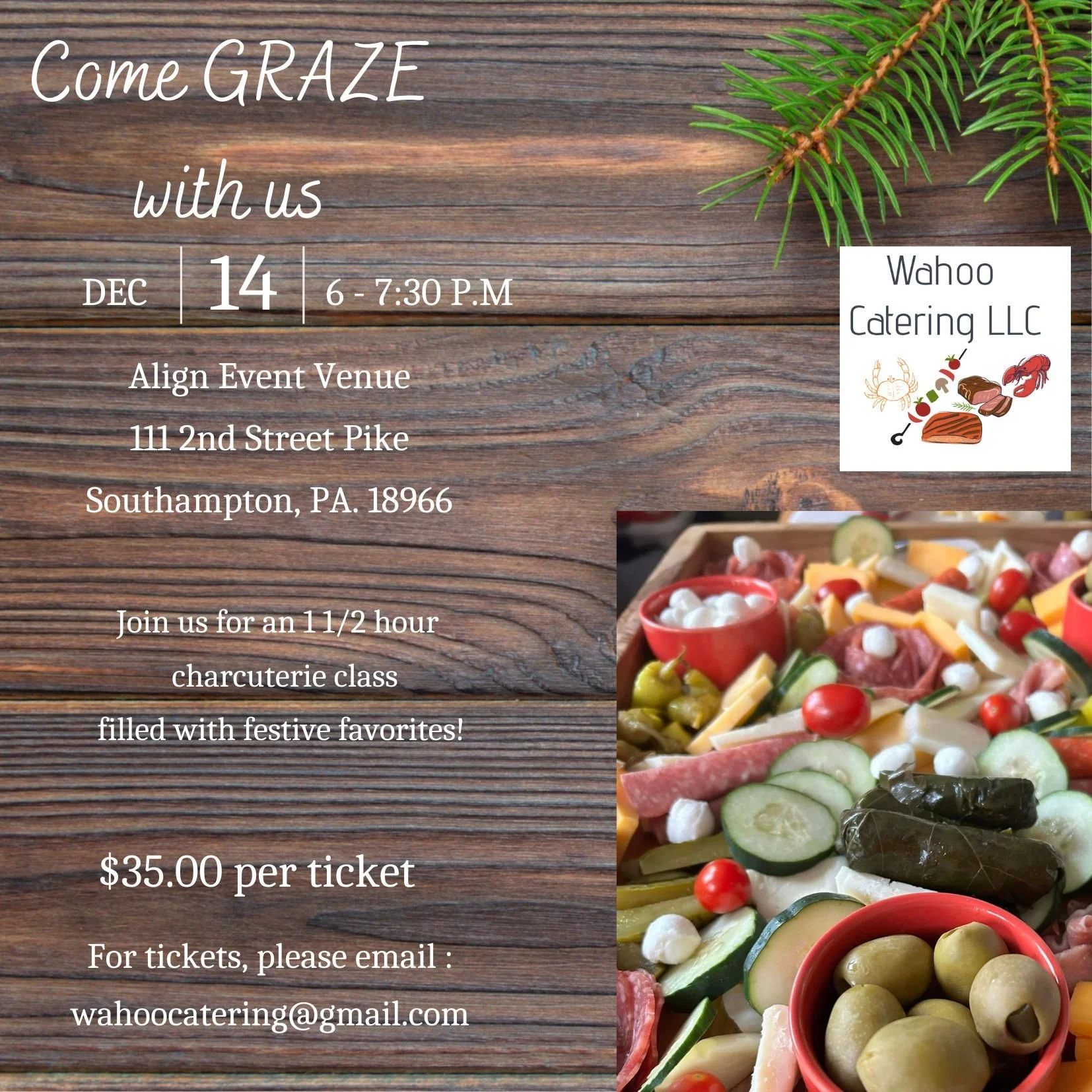 Event invitation for a charcuterie class on December 14th from 6 to 7:30 PM at Align Event Venue, Southhampton, PA. Features festive-themed design, a pine branch, and a photo of a variety of cheeses, meats, and vegetables for the class.