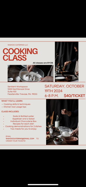 Event flyer for a cooking class on October 19, 2024, from 6 to 8 p.m. at Sentient Workspace, featuring images of food preparation and cooking demonstrations.