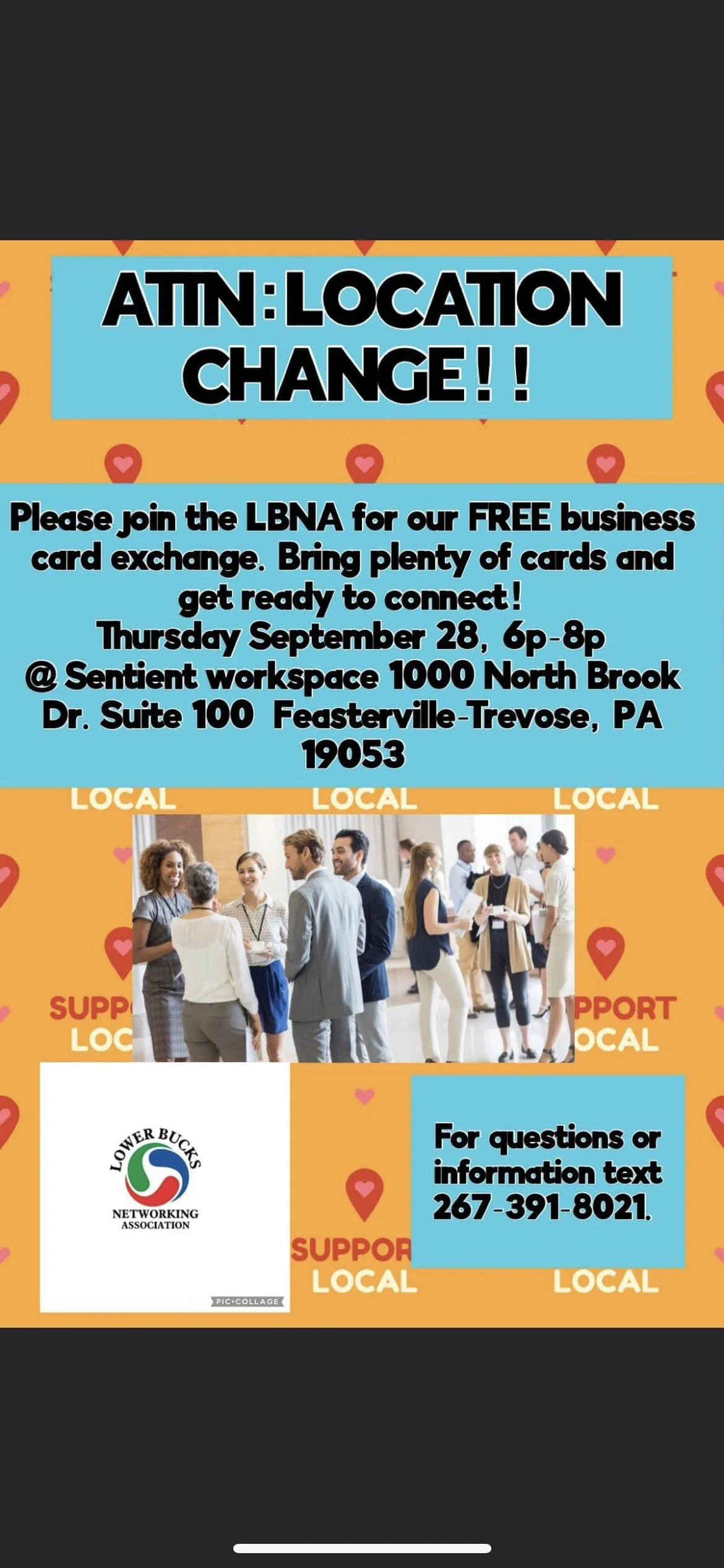 Flyer announcing a location change for a business event hosted by the Lower Bucks Networking Association, including event details and contact information.